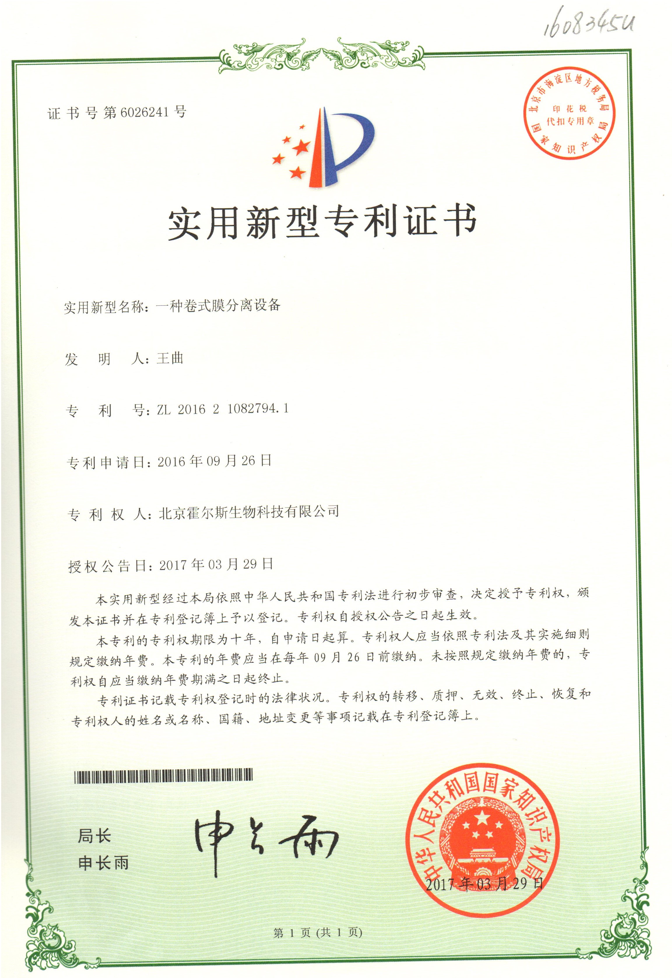 霍爾斯獲得膜分離設備的專利